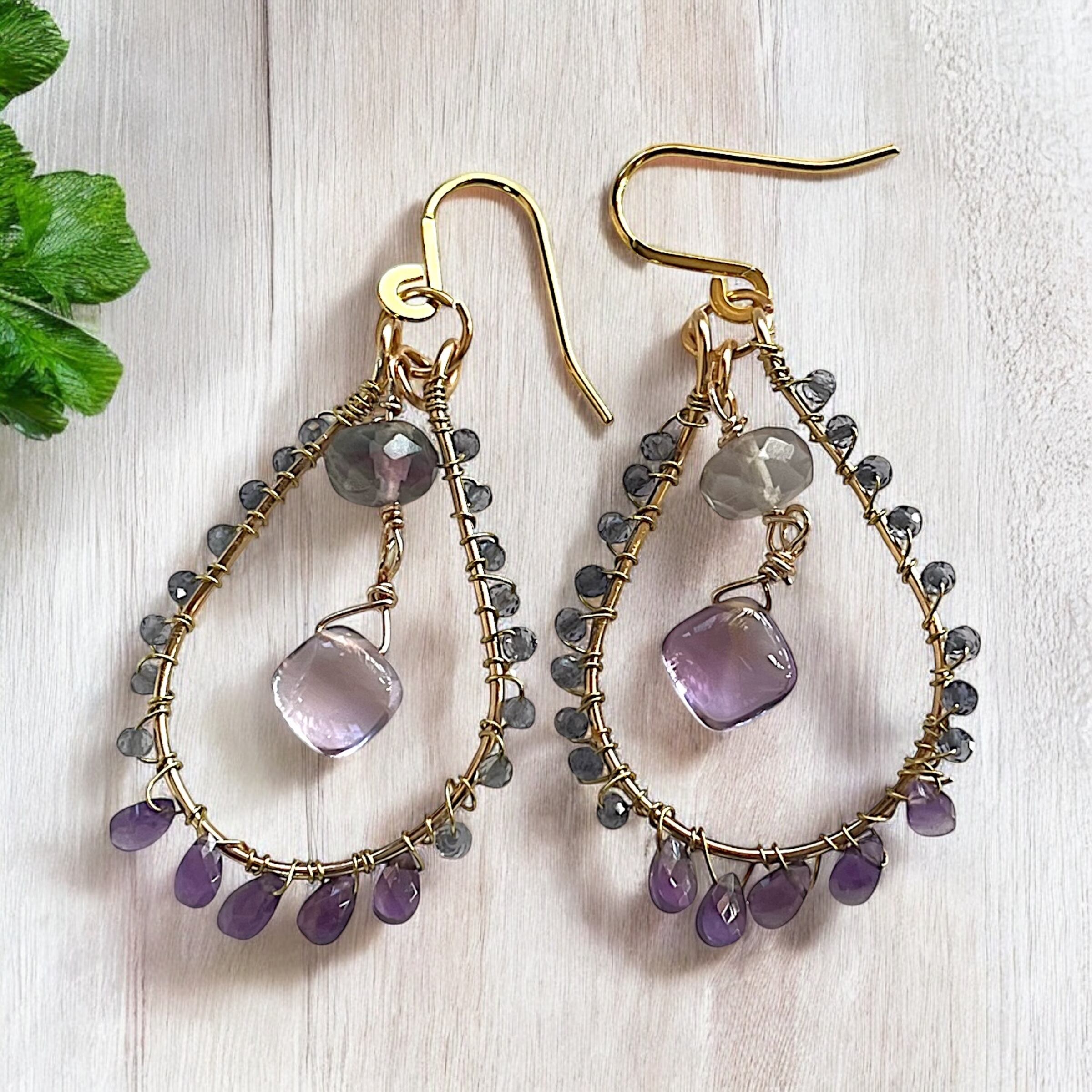 アメジストの深い紫色、アイオライトの神秘的な青、フローライトの薄い紫が華やかに調和したフープピアスです!どんなスタイルにも合わせやすく、特別な日のおしゃれを引き立てるアイテムとして楽しめます。