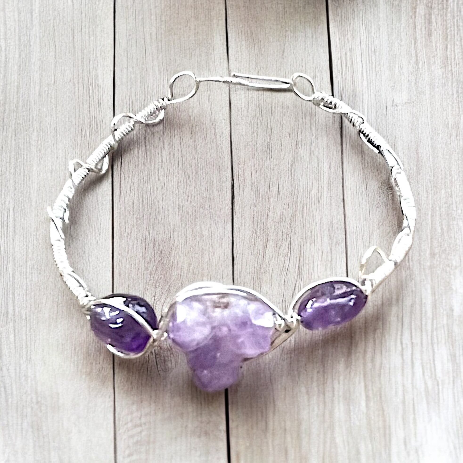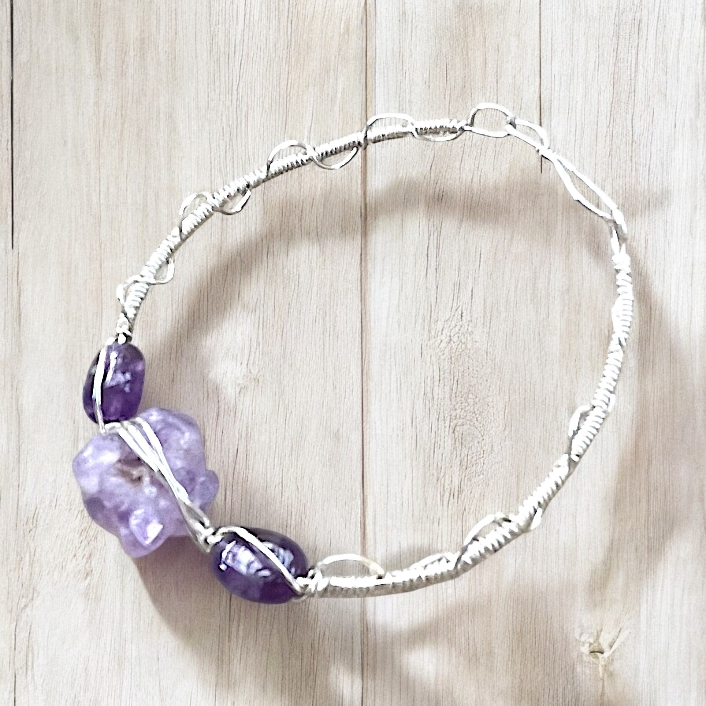 華やかでありながらシンプルなデザインのアメジスト ワイヤーバングルです。濃厚な紫色のアメジストが手首を美しく彩り、日常使いはもちろん、特別な日の装いにもぴったりです!