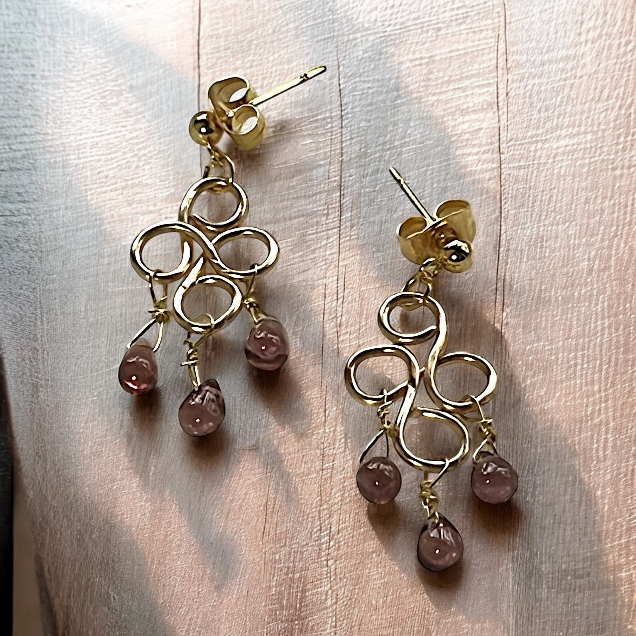 美しいマラヤガーネットを使用したワイヤーアートのポストピアスです。ピンクに近い赤色の輝きが耳元を引き立て、普段使いから特別な日まで、あなたのスタイルに華やかさを添えてくれます!