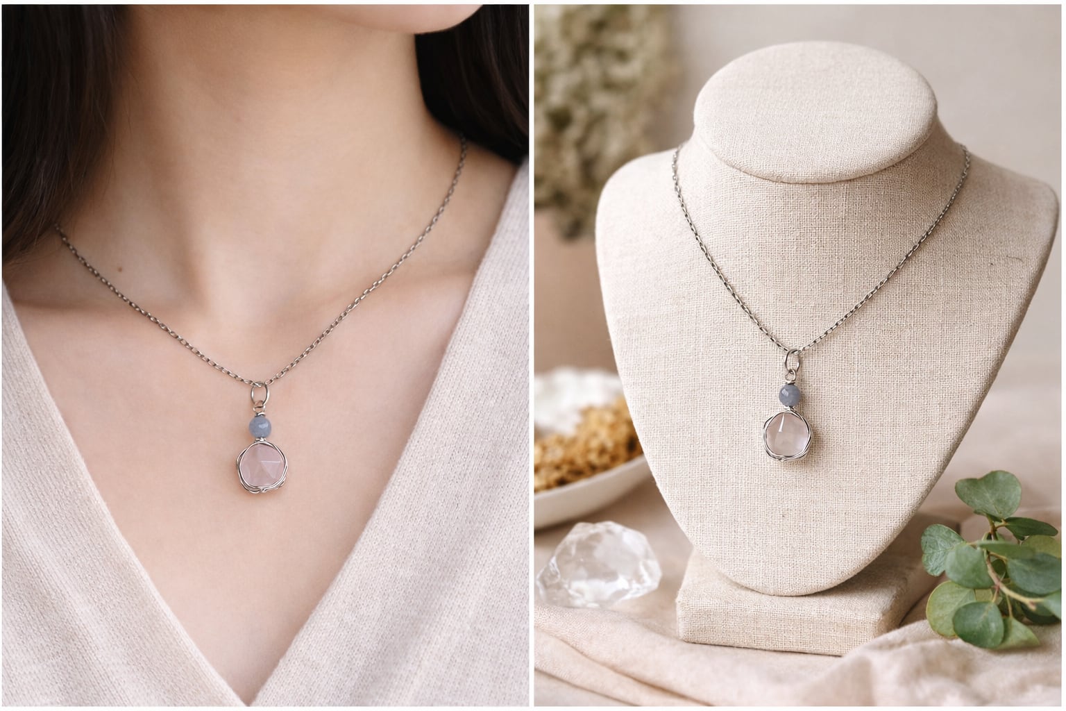 この素晴らしいカルセドニーとアイオライトのネックレスは、穏やかな色合いと光沢感が魅力です。シンプルでありながらも個性的なデザインは、デイリースタイルはもちろん、特別なシーンにもぴったりのアイテムです!