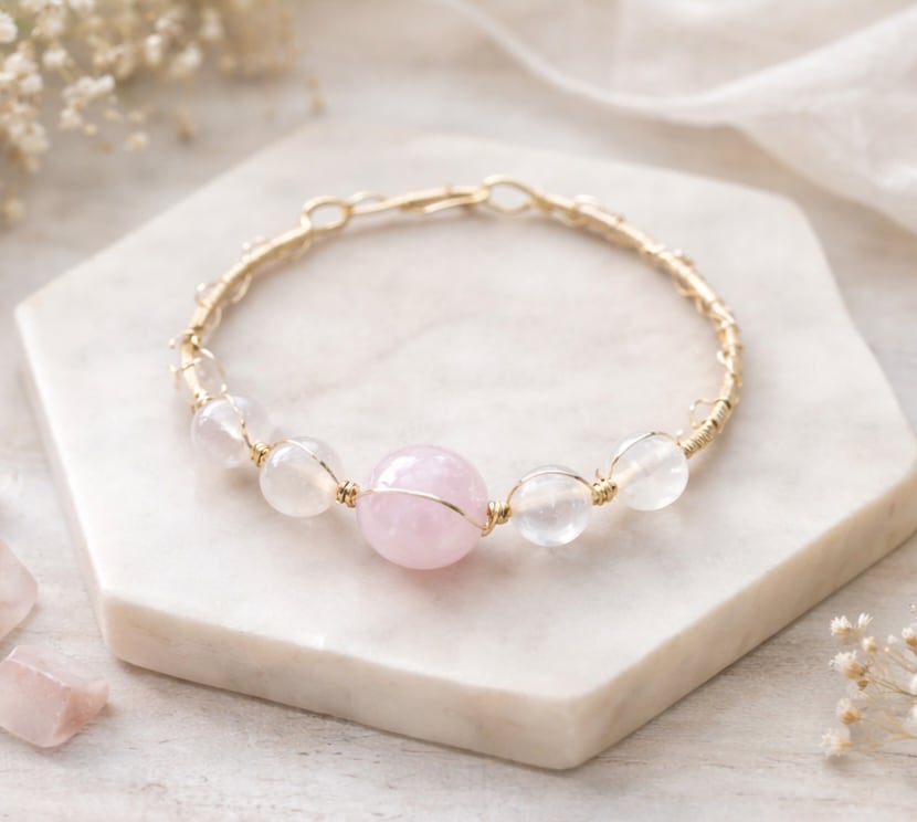 このローズクォーツワイヤーブレスレットは、柔らかなピンク色が優しい雰囲気を醸し出し、あなたの手元を華やかに彩るアイテムです!デイリーユースはもちろん、特別な日にもぴったりで、どんなスタイルにも素敵にマッチします!