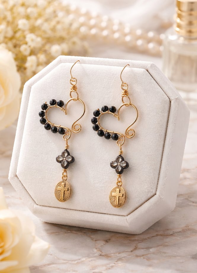 魅力的なハートワイヤーのブラックオニキスとシェルのクロスピアスは、シンプルながらも個性的なデザインが特徴です!ブラックオニキスの神秘的なつや感が、耳元に洗練された印象を与え、シェルの柔らかい輝きが素敵に映えます。カジュアルなコーディネートにピッタリです。