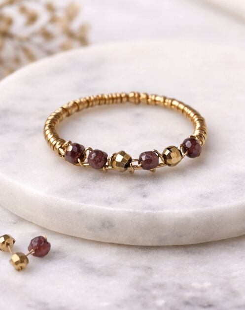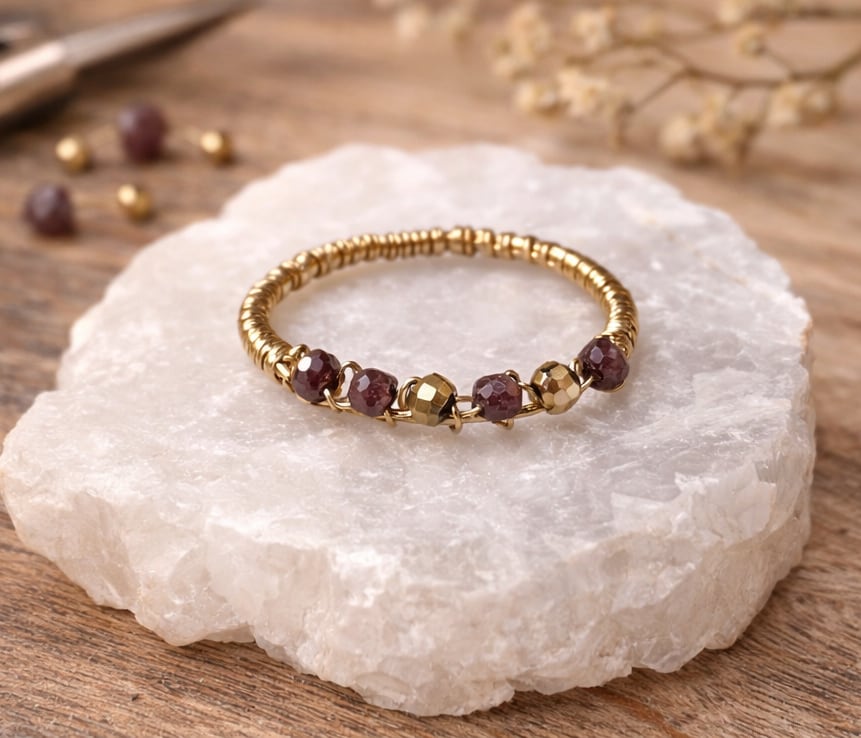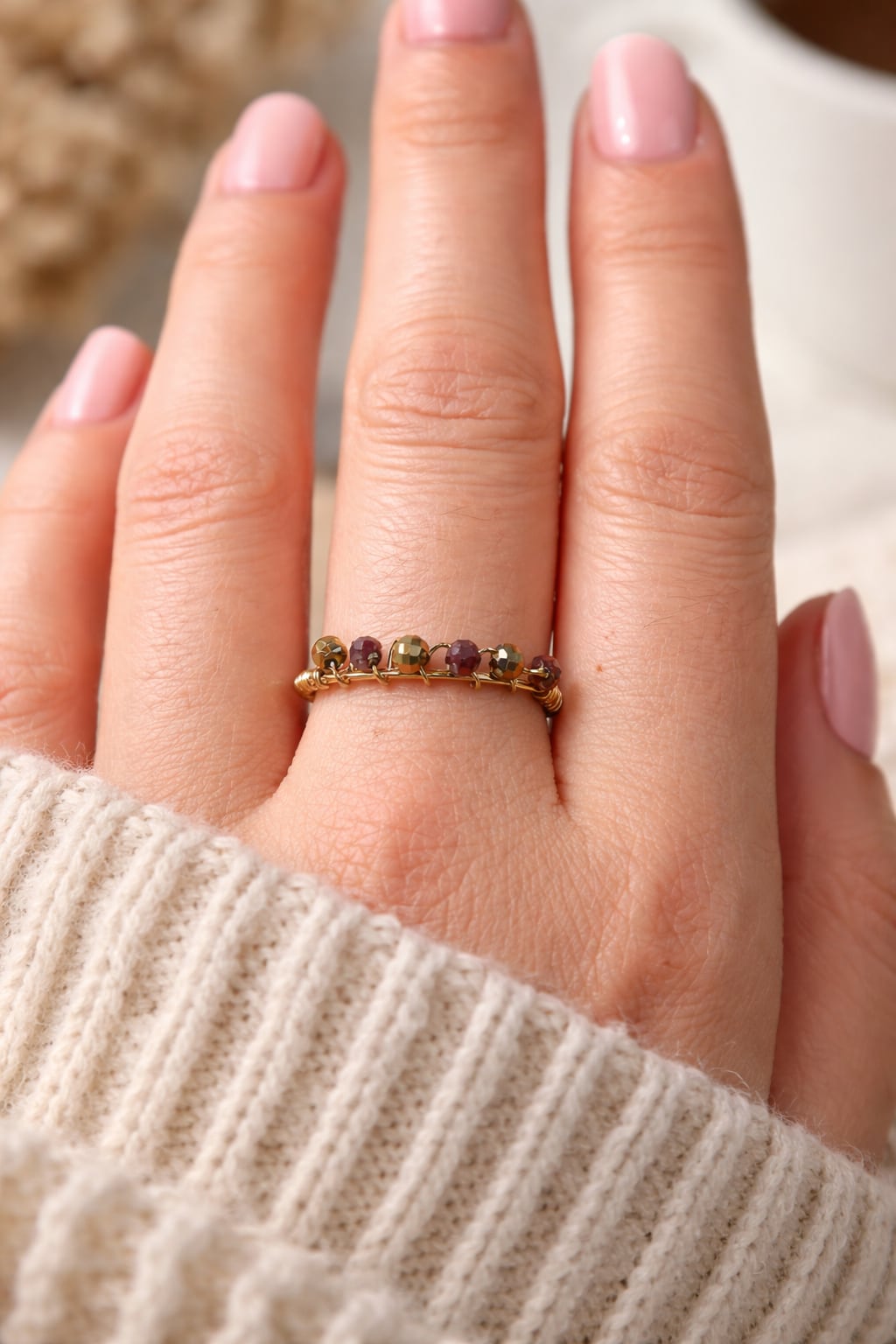 情熱的な赤色のルビーと、力強い光沢を持つヘマタイトが美しく調和した天然石ワイヤーリングです!ゴールドカラーのアーティスティックワイヤーに包まれて、指元をエレガントに彩ります。特別な日やカジュアルな日常使いまで、幅広くコーディネートに活躍する一品です!
