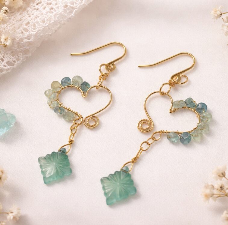 色とりどりのフローライトが、優しい色合いのワイヤーハートで包まれた天然石ピアスです!その独特の多彩な色彩と上品な輝きは、耳元をシックに演出し、カジュアルからフォーマルまで幅広いスタイルにマッチします。この一品は、特別な日や日常使いでもおしゃれに決まるアイテムです!