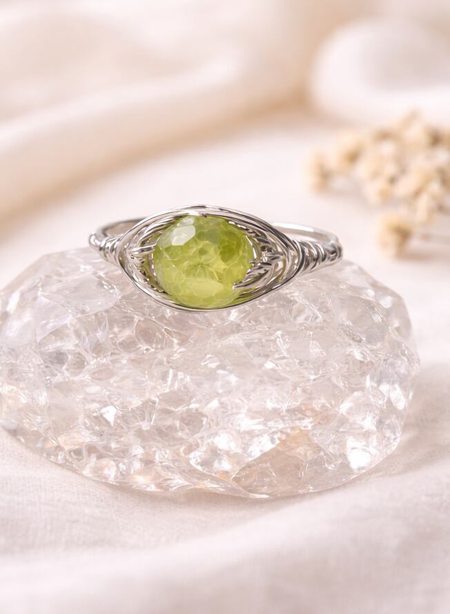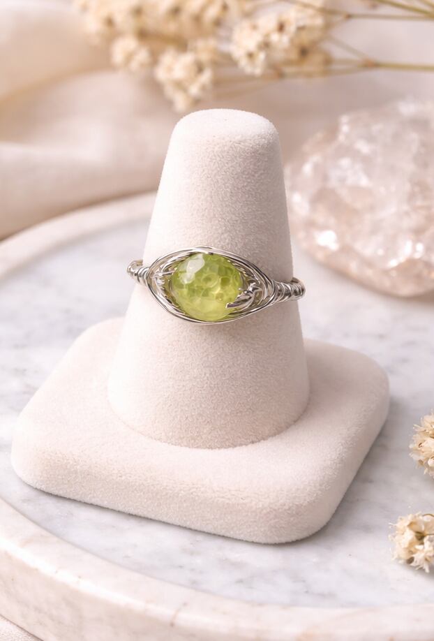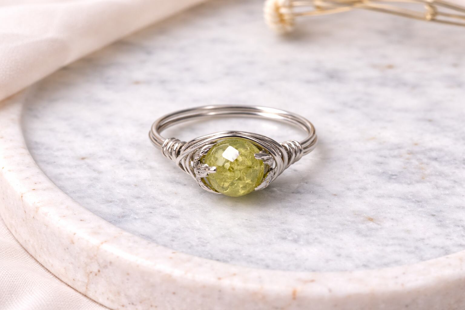 クラッククリスタル 天然石ワイヤーリング グリーン silverカラー 10号