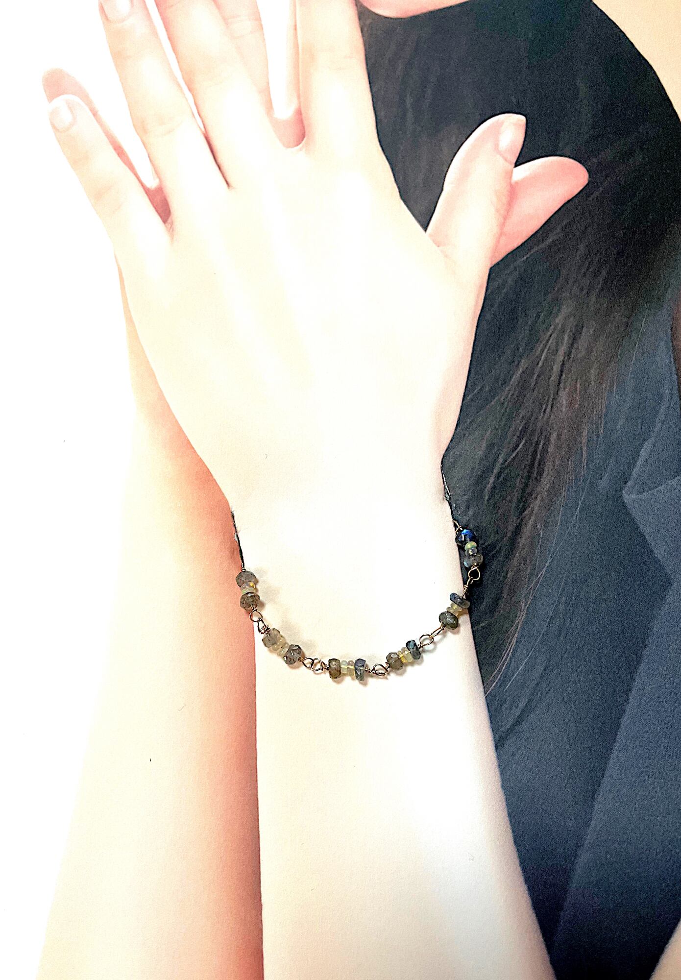 華やかに輝くラブラドライトとエチオピアンオパールが美しい、14kgfのブレスレットです。手首にフィットするサイズ感と、高級感あふれるゴールドの輝きが、お手元を美しく飾ります。