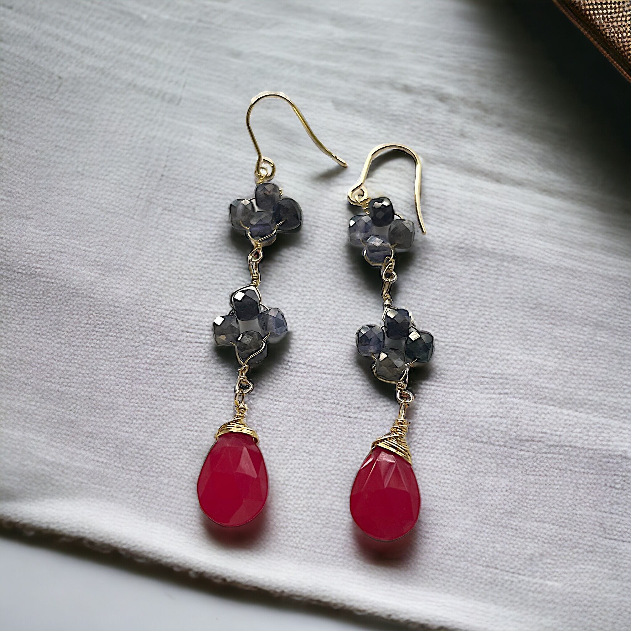 華やかな輝きが魅力のフューチャーピンクカルセドニーとアイオライトのフラワーピアス。フェミニンさと個性を兼ね備えたデザインで、さまざまなスタイルに華やぎを添えます。