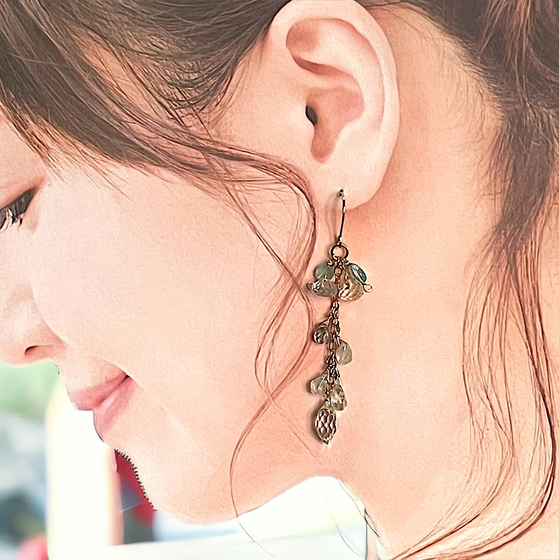 グリーンアメジストやフローライトの美しい色合いが目を引く、シャラシャラとした輝きが特徴の天然石ピアス。自然の恵みが詰まったピアスは、身に着けるだけで心が落ち着きます。天然石の持つパワーと美しさを感じながら、毎日の装いに彩りを添えてみてください。