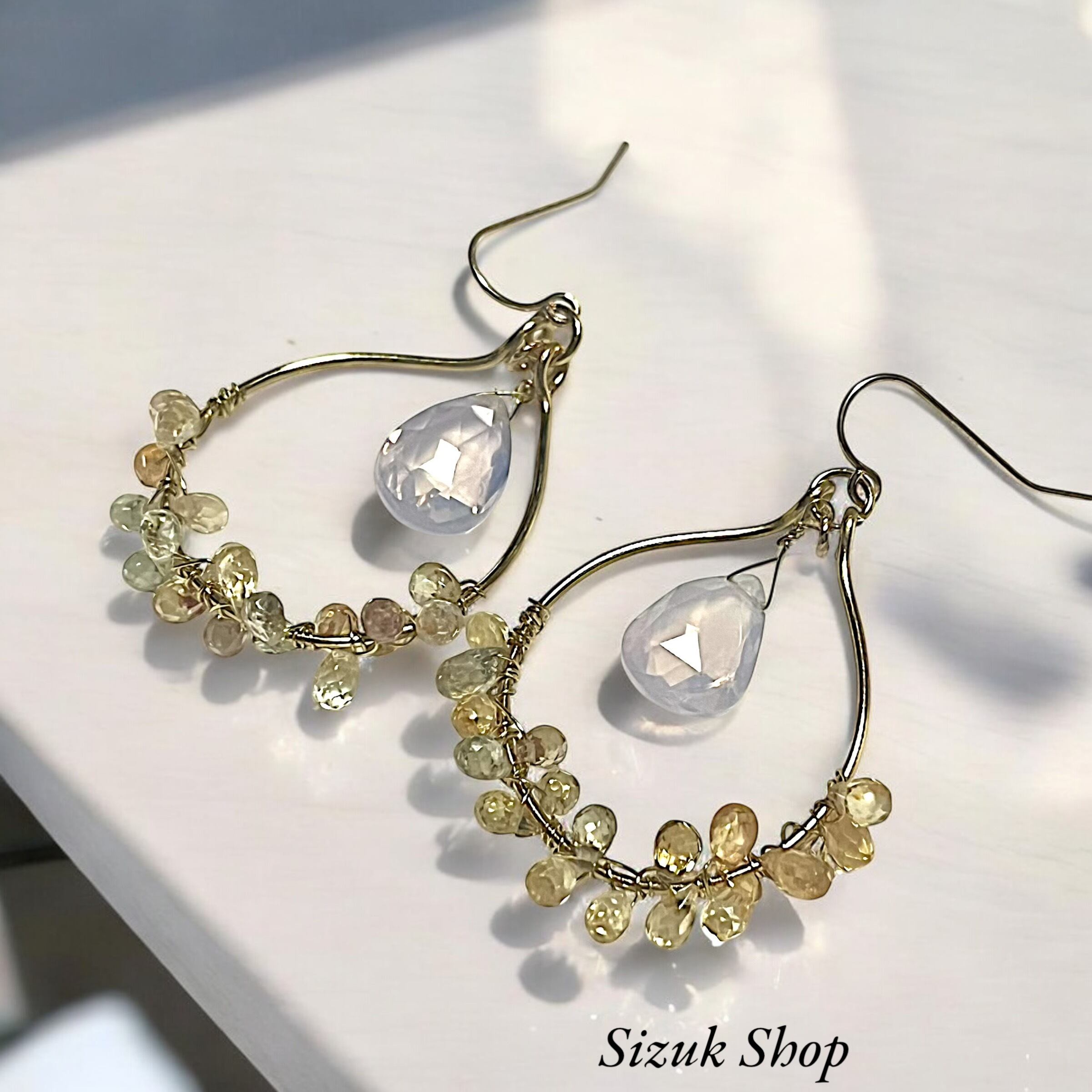 透明感のあるジルコンと柔らかなスコロライトが織りなすフープピアスは、耳元を優雅に演出します。ジルコンの煌めきが光を反射し、華やかさを添え、どんなシーンにもマッチします。カジュアルスタイルにはもちろん、特別なイベントにもピッタリのアイテムです。