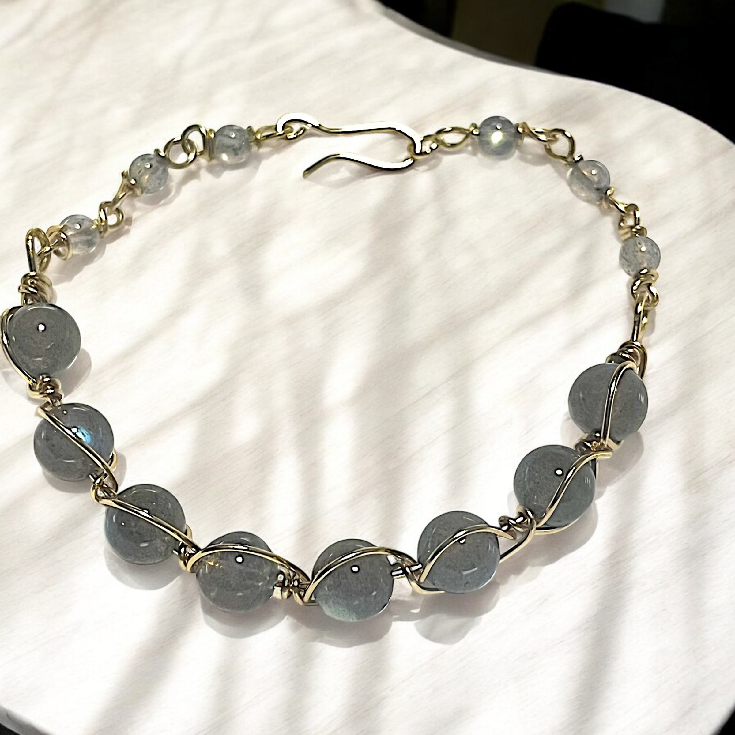 神秘的なラブラドライトのブレスレットは、手元を美しく引き立てるアイテムです。ラブラドライトの独特な遊色効果が光を受けて輝きます。デイリーから特別なシーンまで、幅広くお楽しみいただけます。
