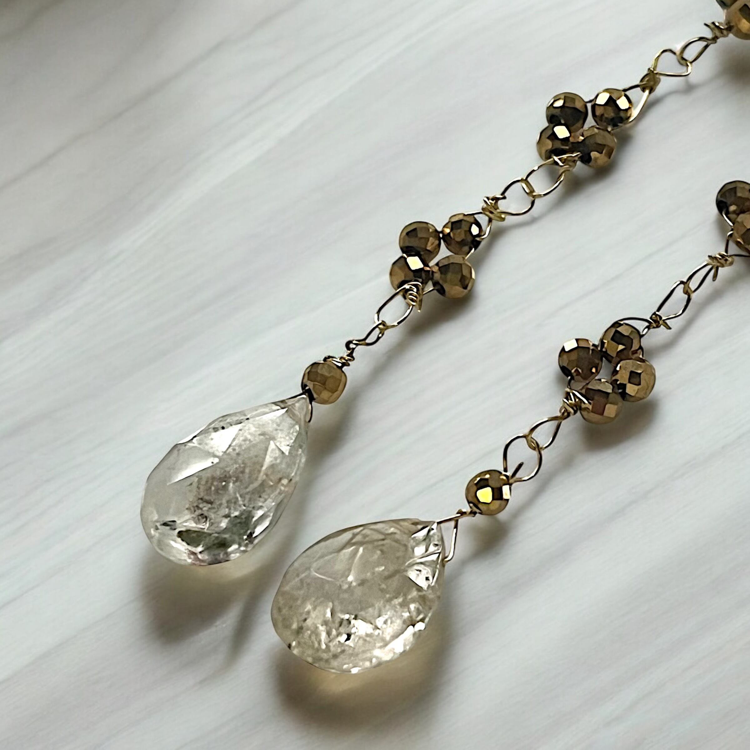 この雪の華 ヘマタイトとガーデンクォーツのピアスは、耳元で優雅に揺れ、特別な輝きを放つデザインとなっています。ヘマタイトの美しい光沢が、ガーデンクォーツの自然な模様と相まって、シンプルなコーディネートにも華やかさを添えます。特別なイベントからカジュアルな日常使いまで、様々なシーンで活躍するアイテムです。
