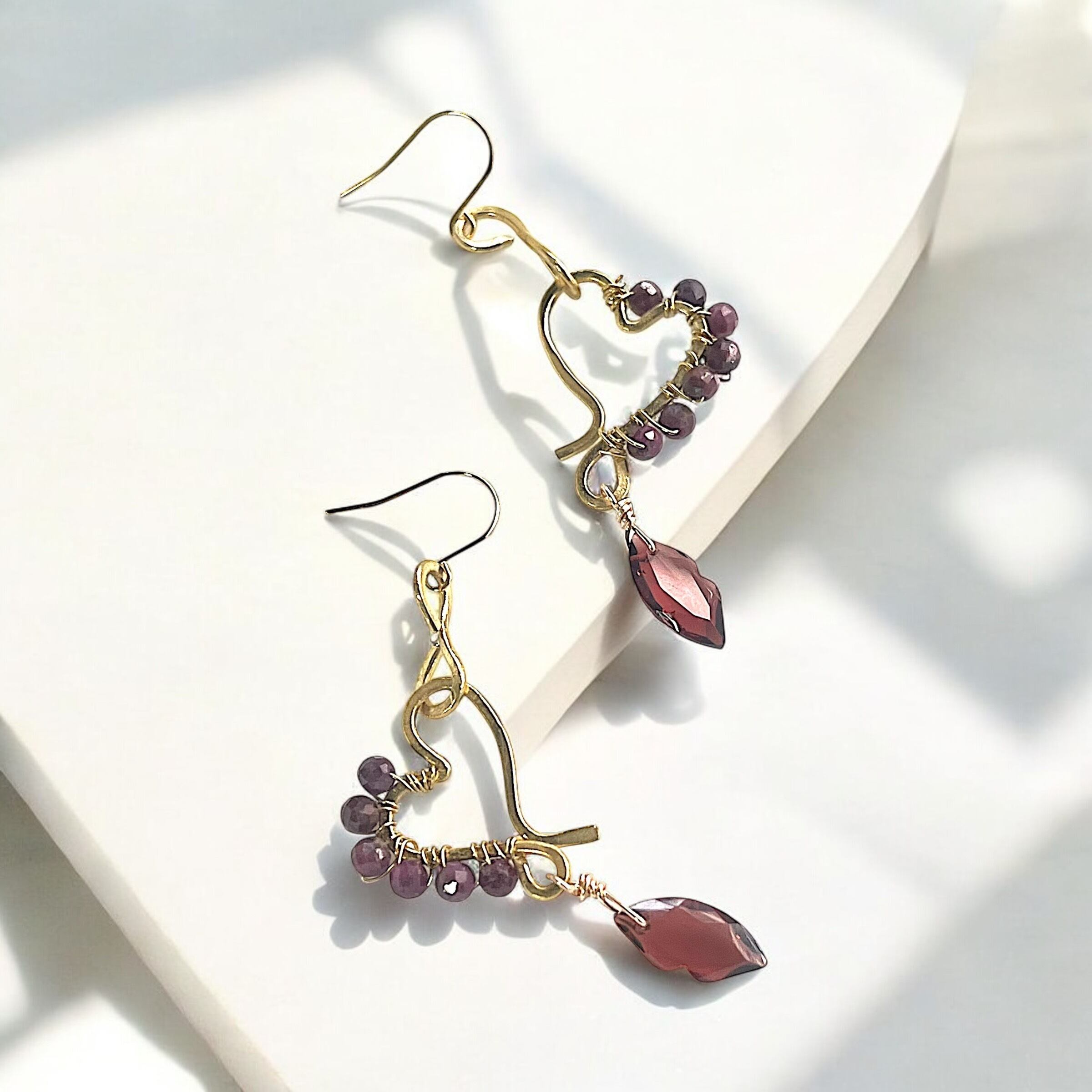 エレガントなハートモチーフと、美しいルビー及びガーネットが耳元で軽やかに揺れ、見る人を魅了するデザインが特徴です。特別な日のおしゃれにも、普段使いにも最適で、あなたのファッションに華やかさを加えることでしょう!