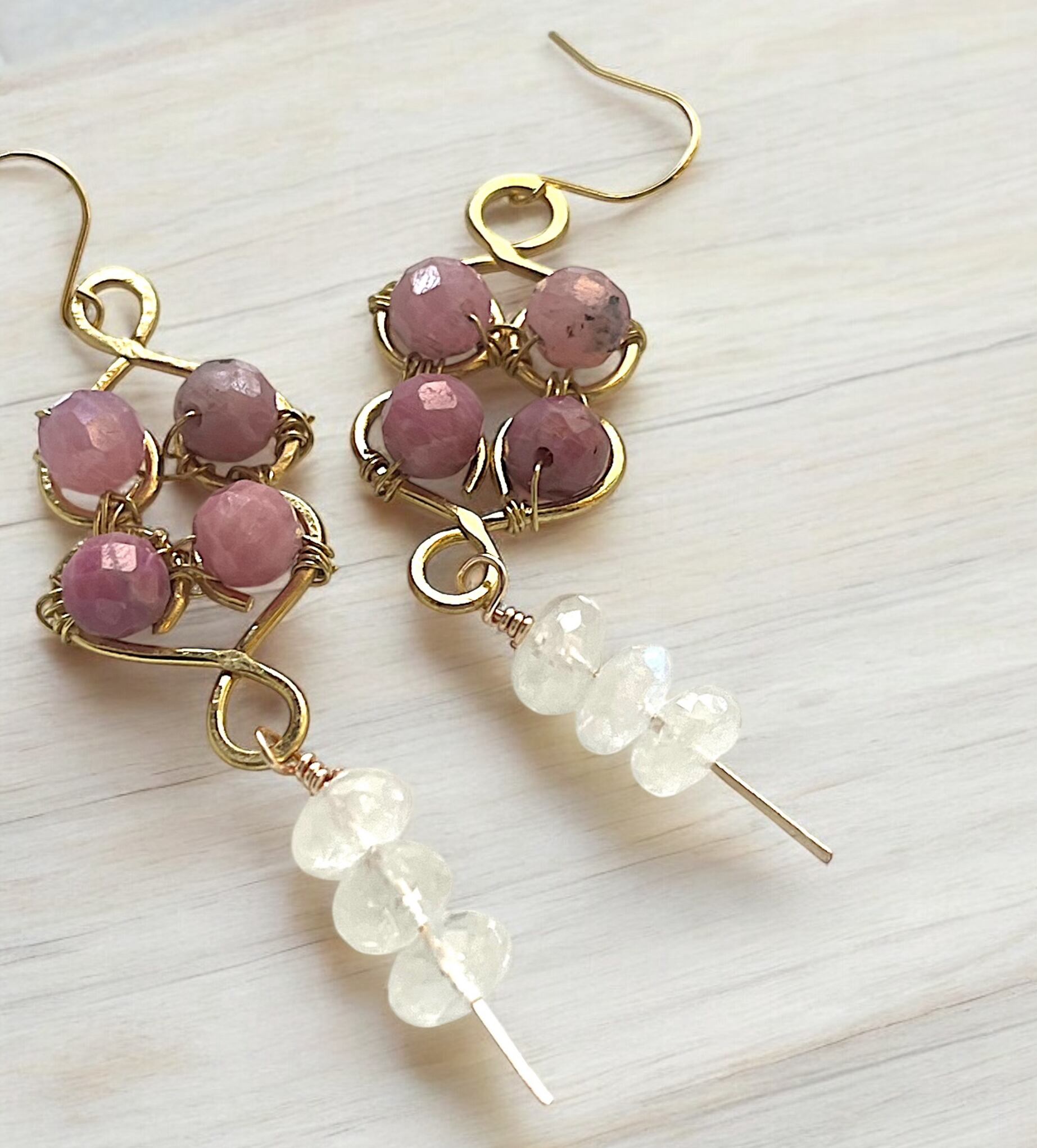 ⭐︎こちらのピアスは、美しいルビーとブルームーンストーンを使用したシンプルでありながら存在感のあるデザインです。日常使いから特別なシーンまで、幅広く活躍します。天然石特有の色合いや模様が、耳元で美しく輝き、あなたの個性を引き立ててくれることでしょう!